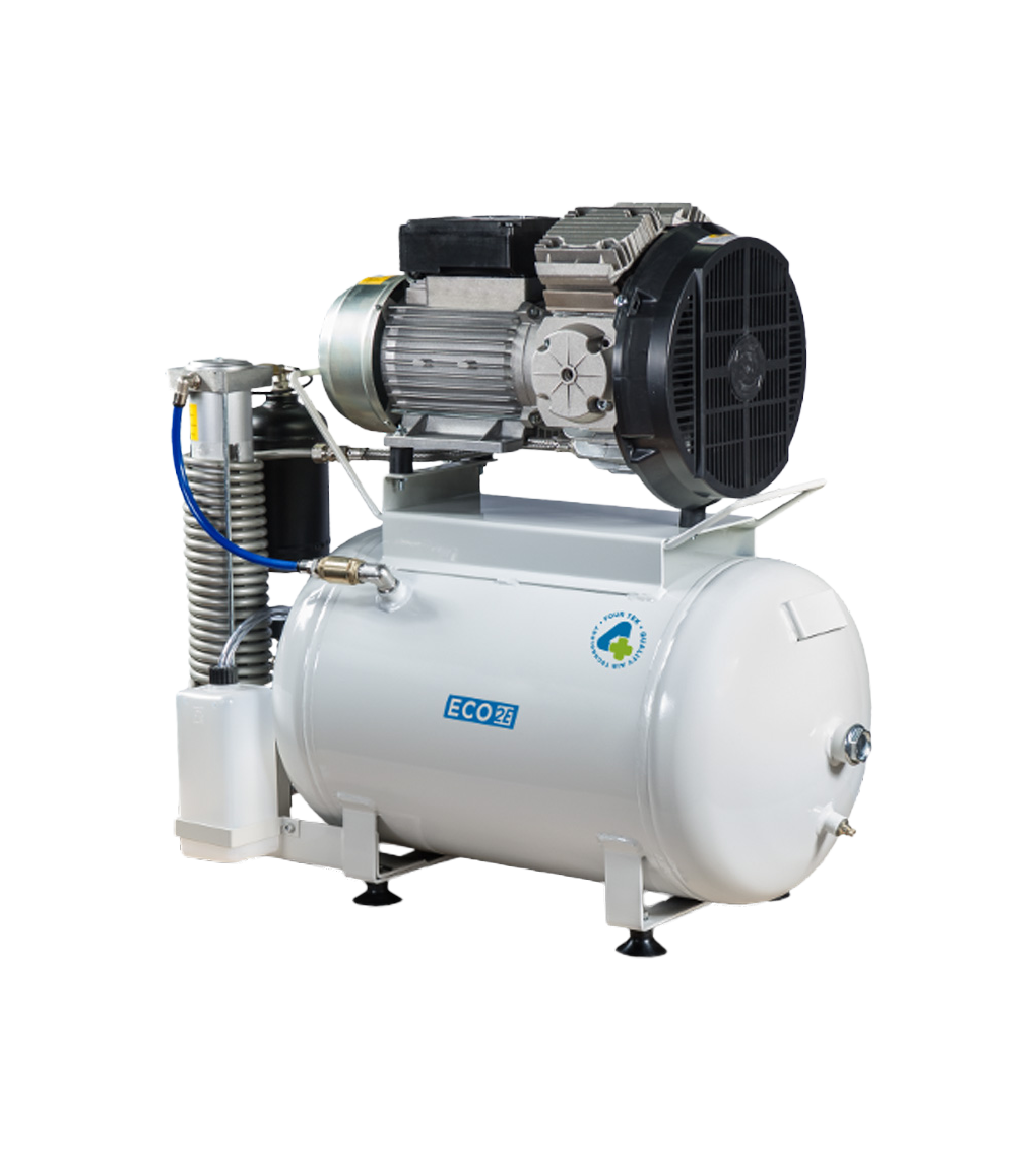 Kompresor bez ulja s tradicionalnim klipovima, 2 cilindra i sa isušivačem.